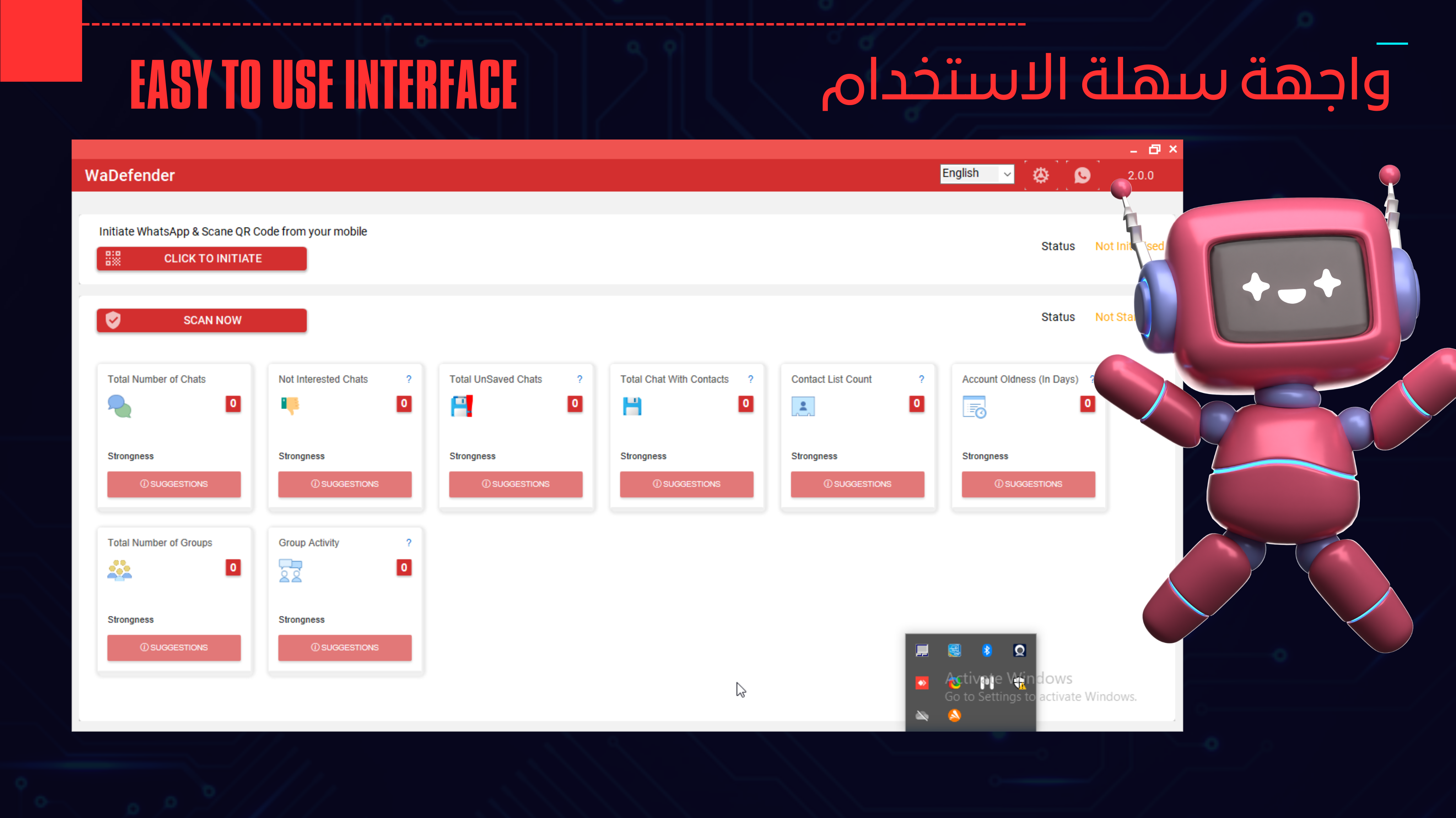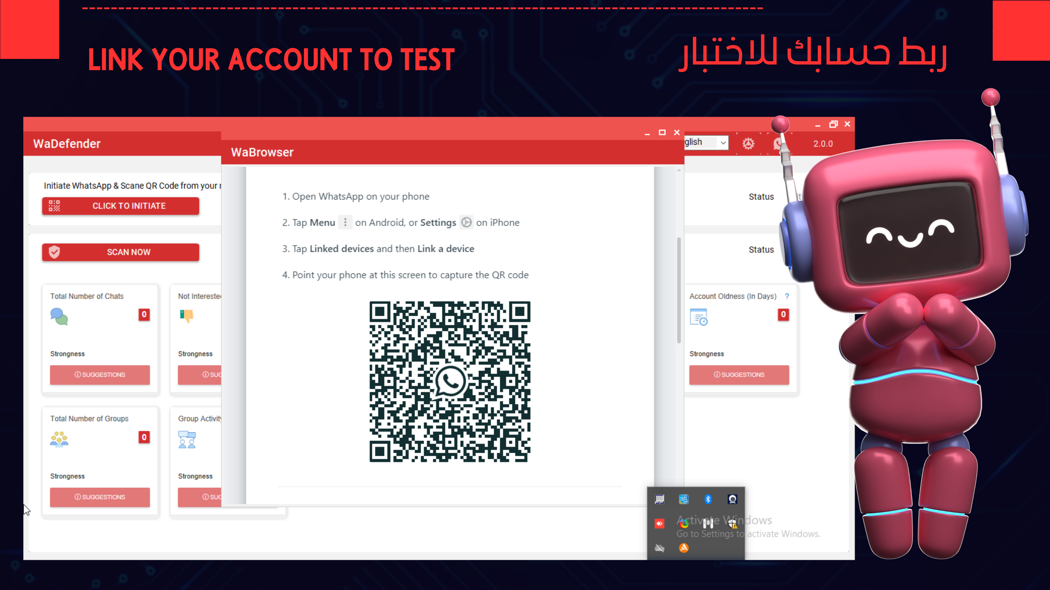 1️⃣ تقوم بتشغيل البرنامج على جهاز الكمبيوتر2️⃣ يتم عمل Scan لحساب واتساب3️⃣ البرنامج يحلل بيانات الحساب وسلوكه4️⃣ يتم استخراج تقرير تفصيلي كامل بالإحصائيات5️⃣ تحصل على نصائح ذكية يجب اتباعها لتجنّب الحظر